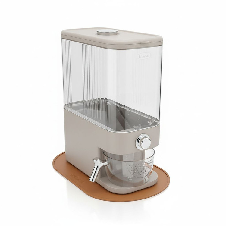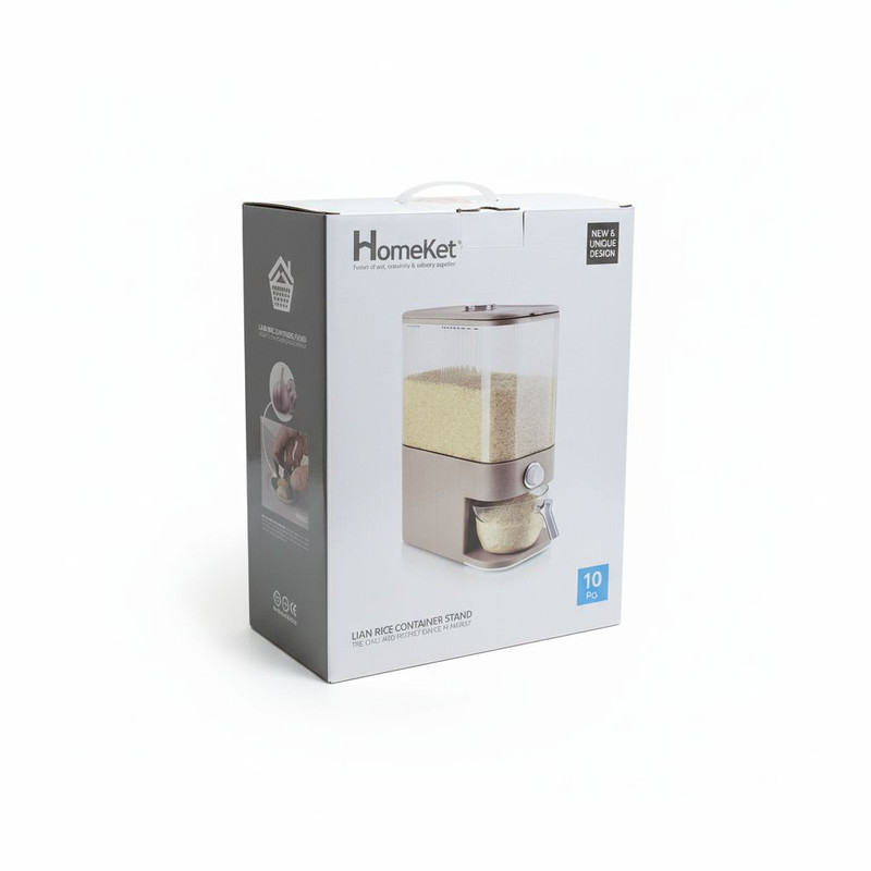 این ظرف برنج ساخت شرکت هوم کت بوده و از کیفیت ساخت بسیار خوبی برخوردار است. علاوه بر کیفیت ساخت بسیار بالای این محصول از طراحی منحصر به فردی برخوردار است که فضای آشپزخانه شما را شیک و زیبا می کند. ظرفیت این ظرف برنج 10 کیلوگرم می باشد. یک محفظه مخصوص برای قرار دادن سیر برای جلوگیری از شته برنج بر روی ظرف قرار داده شده است. پیمانه شفاف یک دسته دارد که برای جابجایی و شست و شو برنج کار را بسیار راحت کرده است و دیگر نیازی به جابجایی ظرف برای شست و شو برنج نیست. زیر ظرف برنج یک پد سیلیکونی هم طراحی و قرار داده شده است که زیبایی آن را چندین برابر می کند.