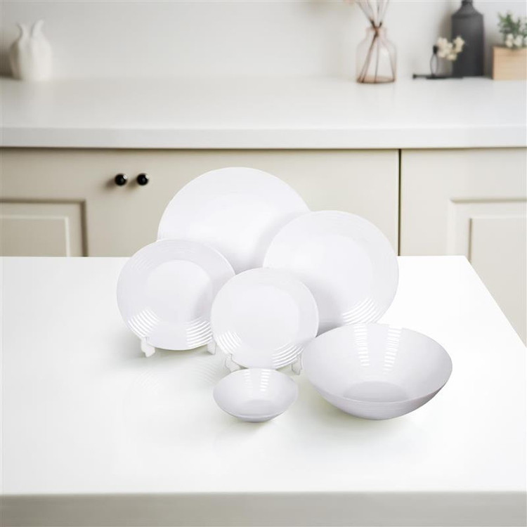 جنس این ظروف از نوع اپال است؛ اپال نوعی شیشه حرارت دیده و با استحکام بالا در مقابل ضربه و شوک حرارتی خواهد بود به همین دلیل در ظروف آشپزی یا پخت و پز سر غذا مورد استفاده قرار خواهد گرفت. تعداد ظروفی که در این بسته بندی قرار گرفته شامل 26 پارچه بوده و برای پذیرایی از شش نفر کاملا مناسب خواهد بود. استفاده از این ظروف به طور یکسان روی سفره یا میز پذیرایی، باعث بهتر دیده شدن پذیرایی شما و هیمنطور افزایش اعتماد به نفس میزبان میشود.