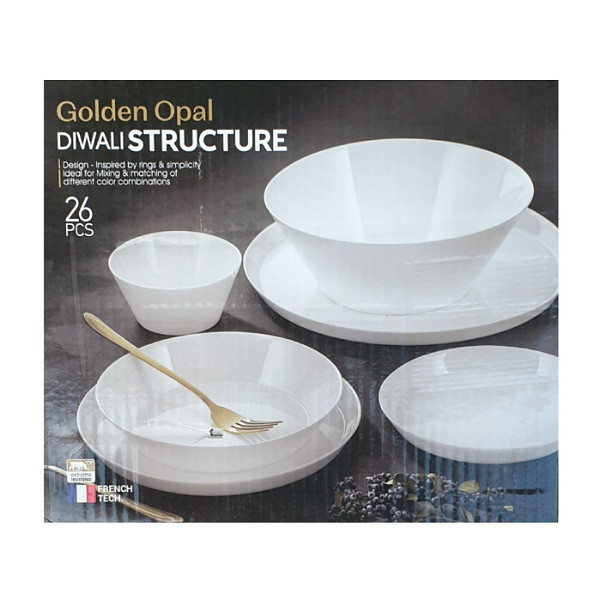 سرویس ۲۶ پارچه استراکچر گلدن اوپال یکی زیبا ترین و مناسب ترین قالب های لومینارک فرانسه میباشد که توسط شرکت گلدن اوپال در ایران تولید و عرضه میشود. این سرویس امکان استفاده در ماکروویو و ماشین ظرفشویی را داراست و شامل ۱ عدد دیس گرد _ ۱ عدد کاسه سالاد_ ۶ عدد پیاله ماست _ ۶ عدد پلو خوری_ ۶ عدد خورشت خوری و ۶ عدد پیش دستی میباشد.